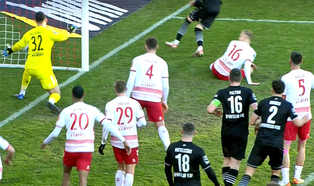 Zwar bugsiert Ganaus anschließend die Kugel per Hacke über die Linie, doch er kommt zweifelsfrei aus dem Abseits. Die spannende Frage: War der Ball nicht schon zuvor über der Linie? Zugegeben: Nicht leicht zu entscheiden.