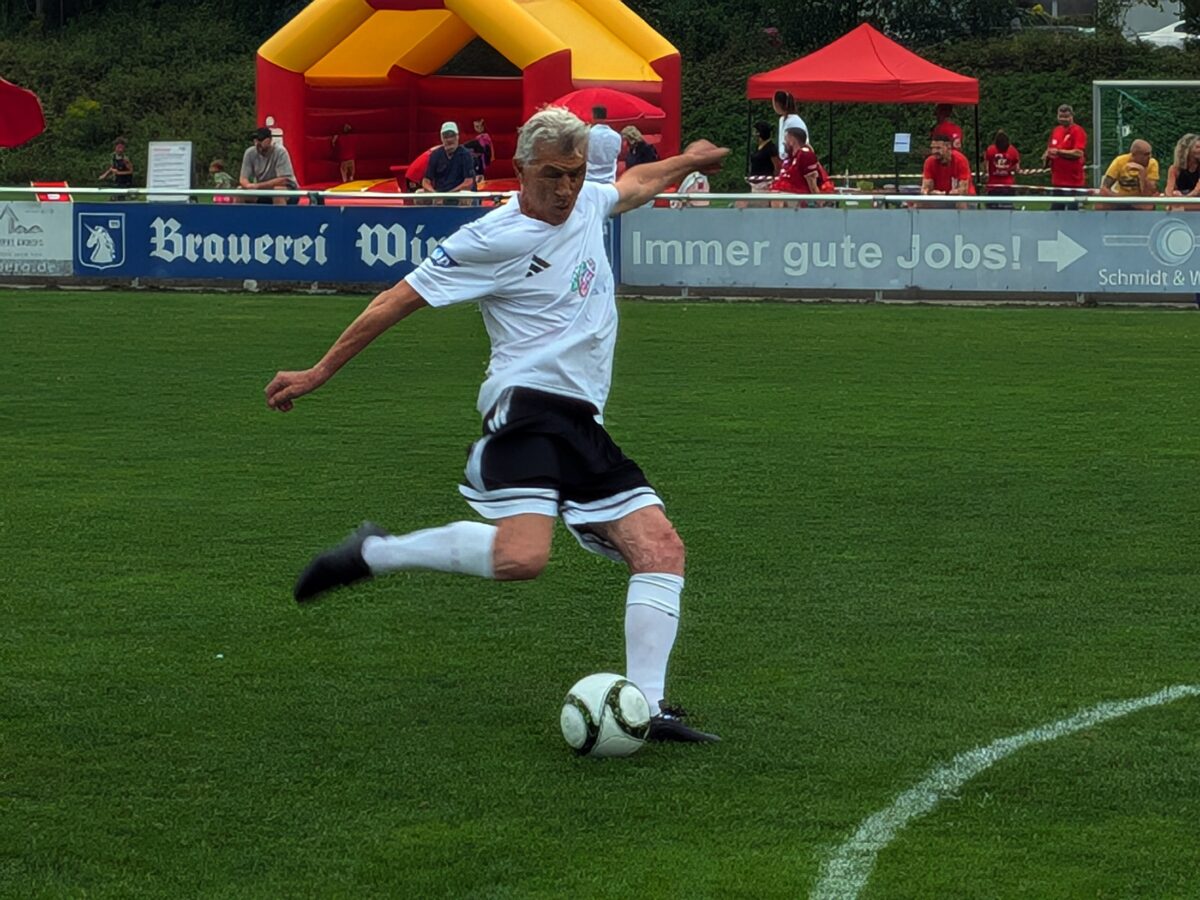 Pünktlich um 14 Uhr betraten die Protagonisten mit nicht weniger als 86 Einlaufkinder den Rasen. Vor allem in der ersten Halbzeit entwickelte sich unter der Leitung von Referee Erdogan Sahinbay ein Spiel auf Augenhöhe. Das 1:0 für die Gäste besorgte nach einer tollen Kombination von Bernhard Heinisch und Nico Beigang kein Geringerer als der bayerische Umweltminister Torsten Glauber, der überlegt zur Führung einköpfen konnte.
