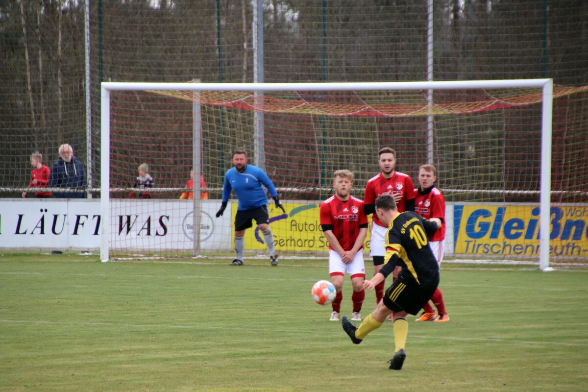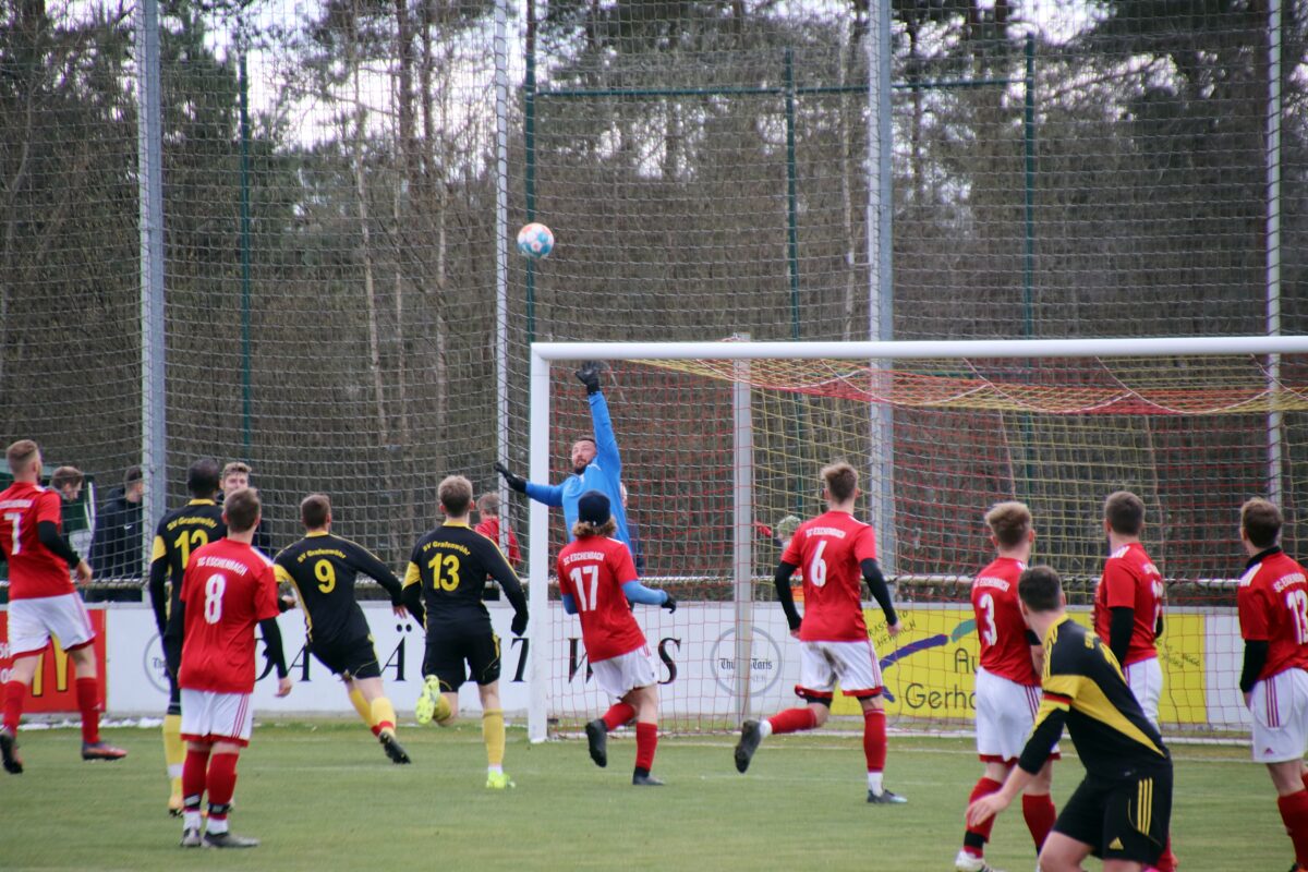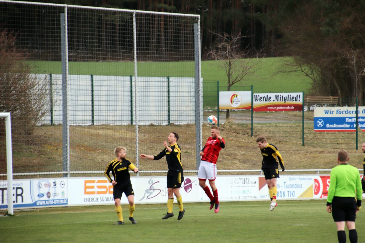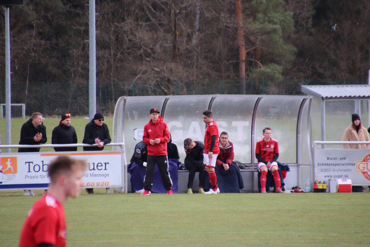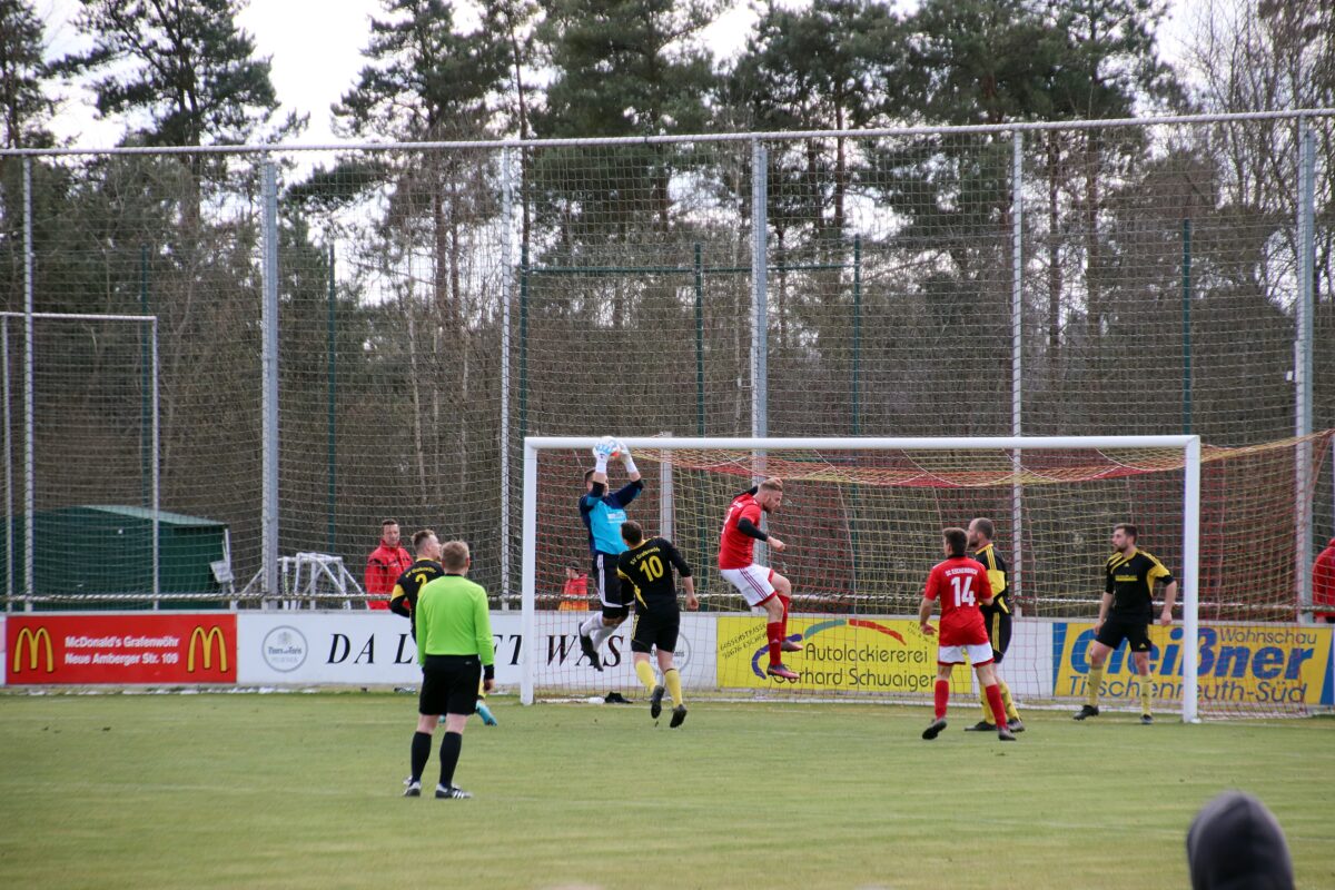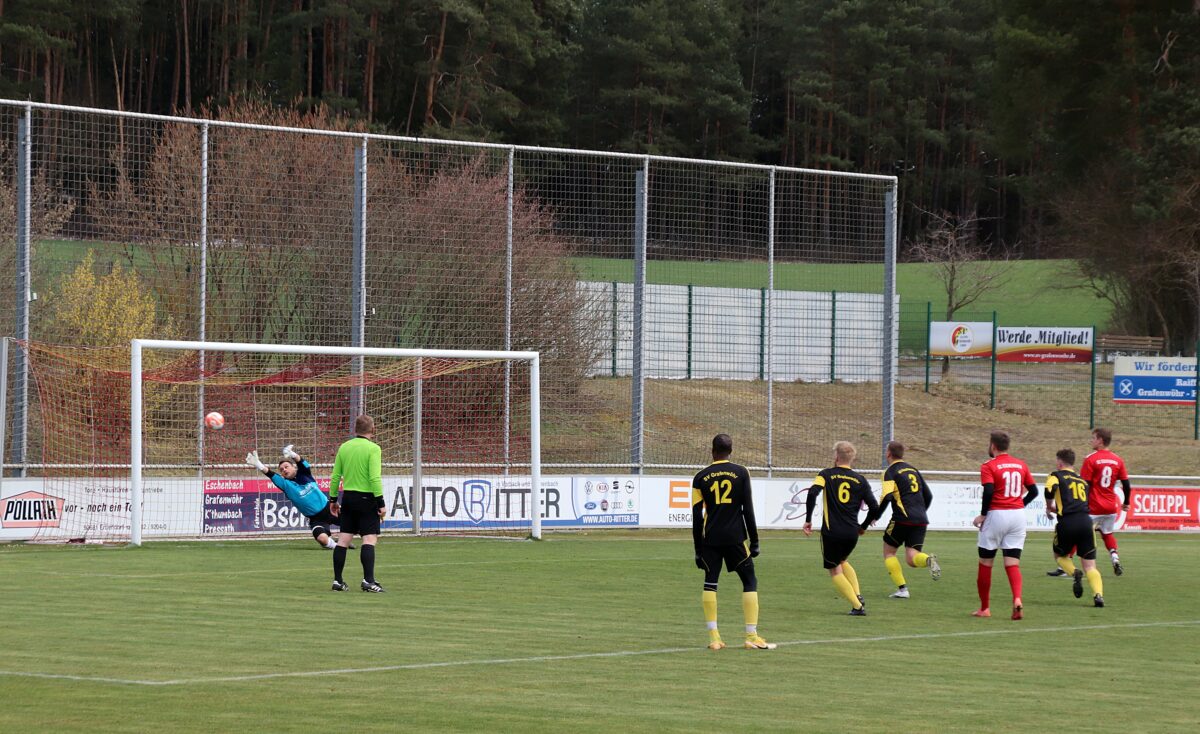 Einen Freistoß aus rund 20 Metern setzte Grafenwöhrs Kapitän Lars Komogowski an die Latte. Weitere Chancen folgten, die Gäste aus der Rußweiherstadt kamen kaum zu Entlastungsangriffen. Doch bei einem dieser Vorstöße wurde Manuel Bitterer gefoult und der souverän leitende Schiedsrichter Manuel Hofmann zeigte auf den Elfmeterpunkt. Doch Timo Adler scheiterte am glänzend parierenden Torwart Luca Wittmann. Danach kamen die Hausherren noch zu einer Großchance, doch Torland Tucker traf nur den Pfosten. So ging es mit einem doch eher schmeichelhaften 0:1 in die Kabinen.