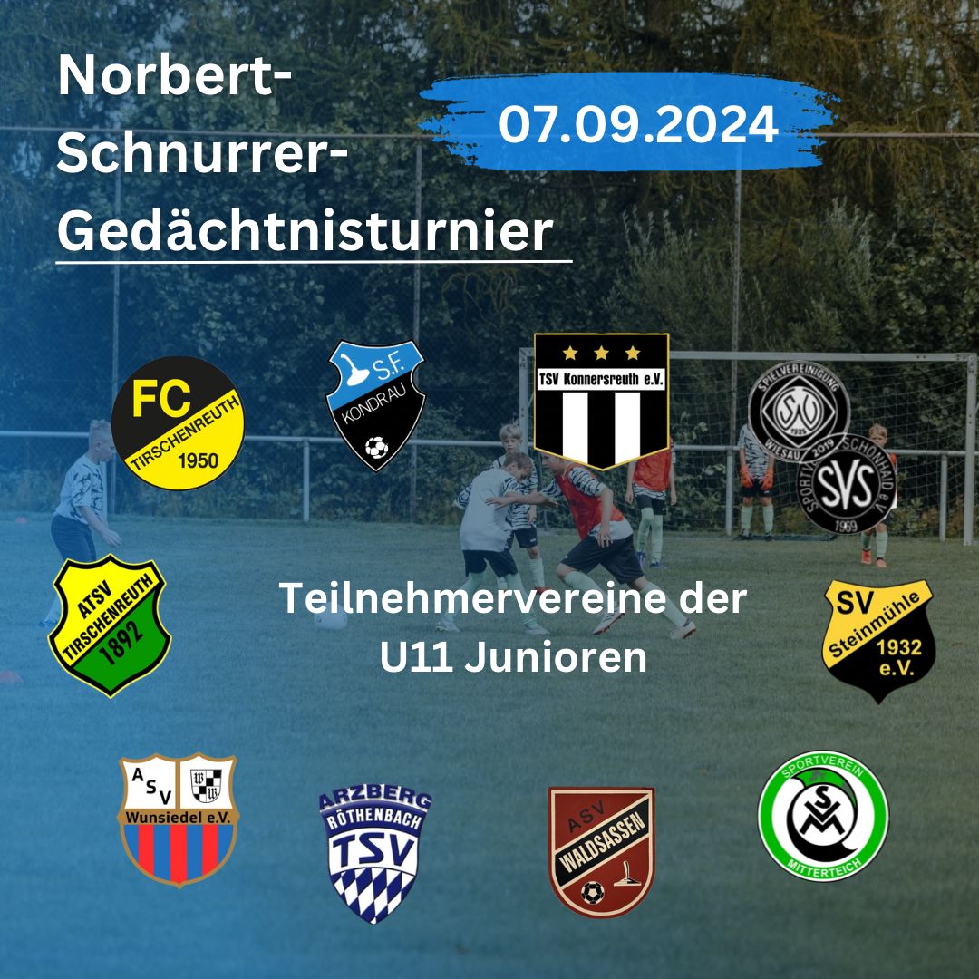 Die Sportfreunde Kondrau richten auch dieses Jahr wieder das Norbert-Schnurrer-Gedächtnisturnier aus. Am Samstag, 7. September 2024, ehren sie damit den verstorbenen Nachwuchstrainer Norbert Schnurrer. Das Kleinfeldturnier für E-Jugendmannschaften (U11) beginnt um 14:00 Uhr auf dem Sportgelände in Kondrau. Die zehn Teilnehmermannschaften spielen um den Wanderpokal. Die Siegerehrung findet gegen 17:00 Uhr statt.