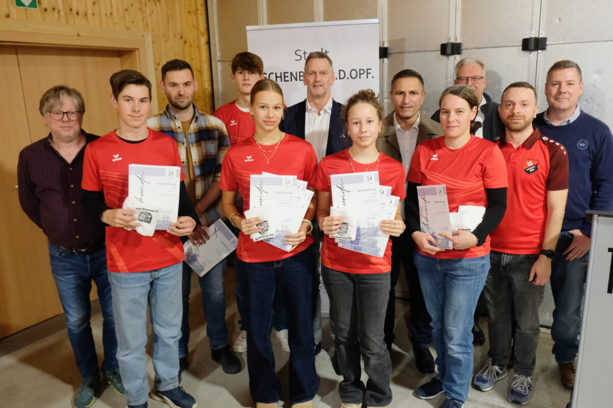 Beim Ehrungszeremoniell zeigte sich vor allem die bemerkenswerte Spartendichte und Breitensportarbeit des SCE. Unterstützt vom SC-Führungspersonal und den Vertretern des Stadtverbandes begann Bürgermeister Marcus Gradl mit der Auszeichnung der Mannschaftssportarten. „Unbesiegt mit dem besten Angriff, der stärksten Abwehr und einem imponierenden Torverhältnis“ hieß es bei der Ehrung der E-Jugend-Fußballer für die Meisterschaft der Saison 2024/25. Glückwünsche galten auch dem Trainer-Trio Carlos Tejada, Christian Schreglmann und Markus Walberer. Zu Ehren kam auch die B-Jugend für die Meisterschaft in der Kreisklasse. Die „internationale“ Truppe mit Kickern aus den Clubs in Eschenbach, Tremmersdorf, Neustadt am Kulm und Trabitz und dem Trainergespann Wolfgang Denk, Reinhard Schmidt und Alfred Seitz wurde Kreisklassenmeister. Glückwünsche galten zudem der 2. Herrenmannschaft des SCE zur Meisterschaft und dem Aufstieg in die A-Klasse.