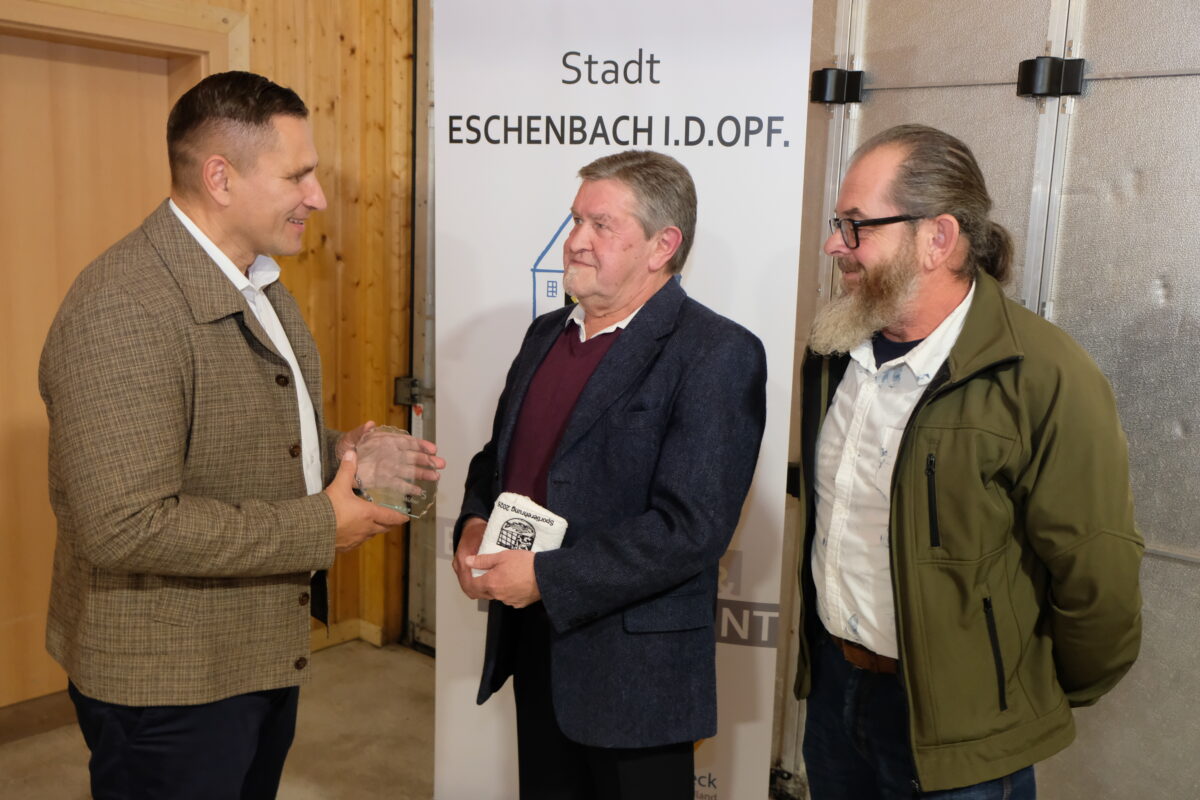 Wenige Tage nach dem Triumph bei der Europashow für Rassetauben in Nitra/Slowakei wartete auf Bernhard Müller in Eschenbach eine weitere Auszeichnung. Bürgermeister Marcus Gradl ehrte den passionierten Taubenzüchter für den jüngst gewonnenen Titel eines Europameisters für „Show-Racer-Tauben“. Zur Ehrung begleitet wurde der Ernstfelder Züchter unter anderem von Werner Kennel, dem Vorsitzenden des Eschenbacher Kleintierzuchtvereins. Urkunden, Handtücher mit eingearbeiteten Stadtwappen und Glaspokale für die Mannschaften, den Europameister und die Deutschen Meister symbolisierten den städtischen Lobpreis.