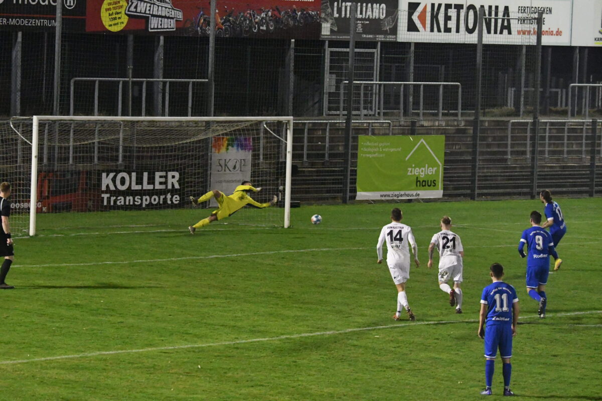 Den fälligen Elfmeter verwandelte David Bezdicka maßgenau ins rechte untere Eck, obwohl Gästekeeper Josef Juradi die Ecke geahnt hatte. Kurz vor der Halbzeit startete Kevin Grünauer den nächsten Tempoangriff über die rechte Seite und seine präzise Flanke landete genau auf dem Kopf von Josef Rodler, der den Ball zum 2:2 ins lange Eck platzierte. Weiden war jetzt obenauf mit dem aktuellen Tabellenvierten.
