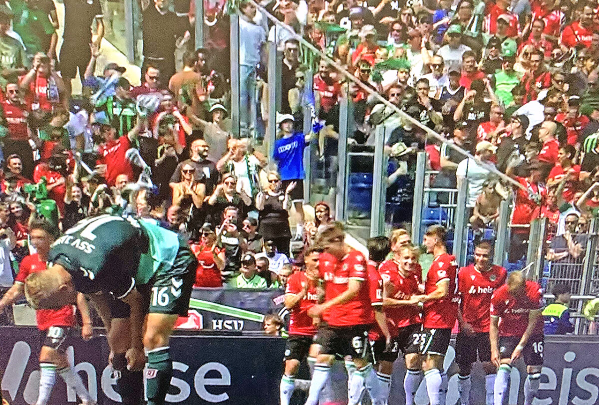 Wieder der fleißige Pröger auf dem Weg in den Strafraum, ein etwas zu ungenauer Querpass auf Bryan Hein, dem die Kugel verrutscht und deshalb eine Etage über die Latte zischt (40.). Um weiter an der Torschuss-Statistik zu schrauben, versucht sich auch Christian Viet aus der Distanz, löst damit bei Zieler aber lediglich ein Achselzucken aus (41.). Jetzt sind die Gäste endlich im Match angekommen. Ganaus Schussversuch aus zwölf Metern blockt Halstenberg ab, den zweiten Ball krallt sich Saller – sein wuchtiger Drehschuss verfehlt das Ziel um einen knappen Meter (42.)