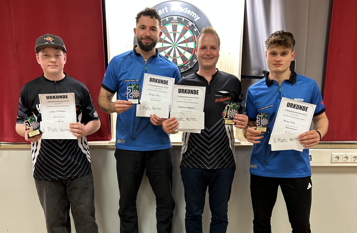 Am Ende gewann bei den Herren Matthias Westphal (DC Wenzenbach) vor Philipp Horn (Steeldart Academy Weiden), Lukas Hofmann und Aaron Zintl (Steeldart Academy Weiden). Aaron stammt aus dem NLZ der SpVgg SV Weiden und muss derzeit beruflich beziehungsweise verletzungsbedingt beim Fußball kürzertreten. Die Damen spielten in einer Vorrunde mit zwei Gruppen mit jeweils fünf Teilnehmerinnen. Danach gab es Viertel- und Halbfinale. Im Finale setzte sich Monika Dirmeier von den Dartfreunden Geisling-Pfatter in einem spannenden Finale gegen Eva Schoreisz vom DC Wenzenbach durch.