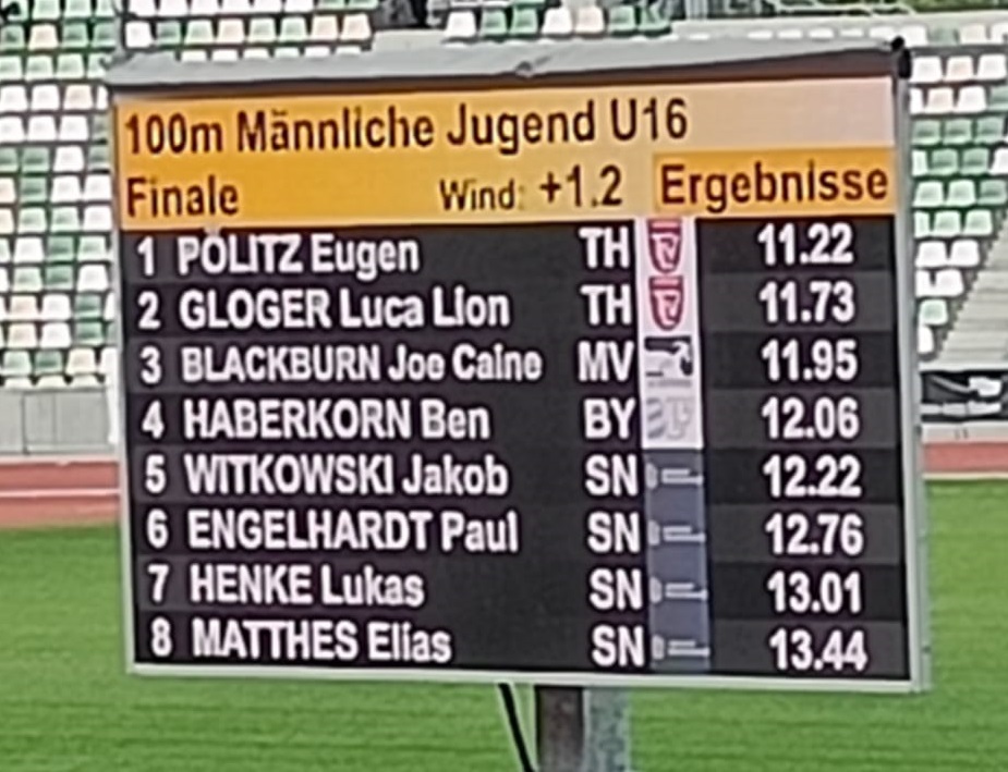 Ben Haberkorn, der mit 14 Jahren in der Altersklasse der älteren U16-Athleten in einem starken Feld startete, zeigte im Vorlauf über 100 Meter eine gute Leistung und belegte den zweiten Platz. Mit seiner Zeit qualifizierte er sich auch für das A-Finale, in dem er mit einer neuen persönlichen Bestzeit von 12,06 Sekunden einen hervorragenden vierten Gesamtrang erzielte. Diese Leistung unterstreicht sein großes Potenzial und seine kontinuierliche Entwicklung.