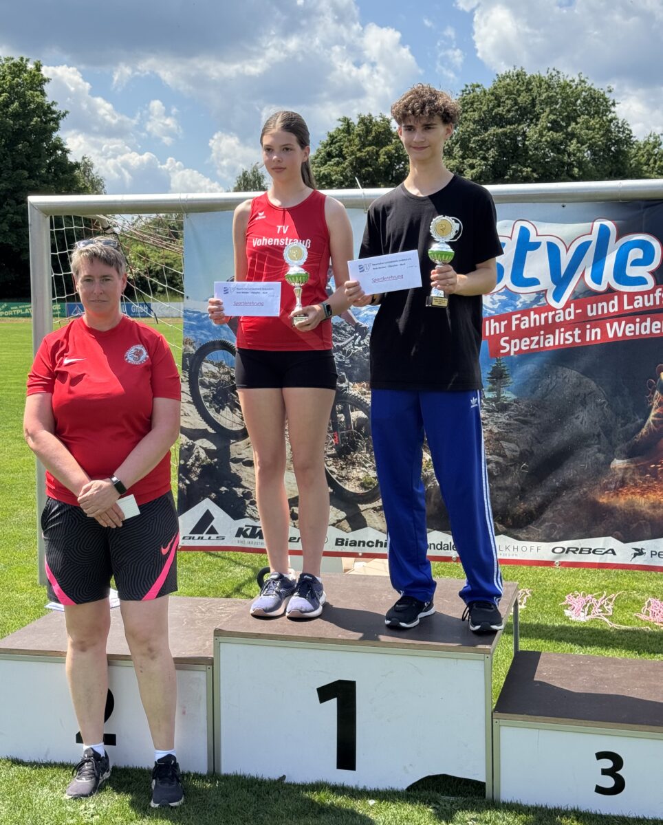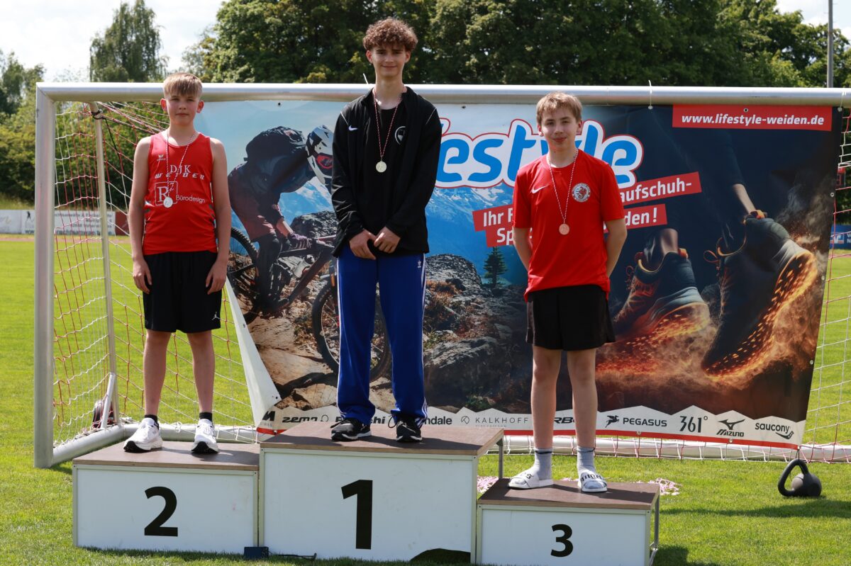 Ben Haberkorn (M14) sicherte sich mit persönlichen Bestleistungen die Siege im 100-Meter-Lauf (12.05 Sekunden) und im Weitsprung. Hervorzuheben ist seine Weite von 5.59 Metern, mit der er – neben dem Sprint – auch im Sprung die Qualifikationsnorm für die Süddeutsche Meisterschaft erfüllte. Im Kugelstoßen holte er zusätzlich noch den zweiten Platz. Ein weiteres erfreuliches Ereignis war die Ehrung für Ben Haberkorn, der vom Kreisverband Oberpfalz-Nord für seine im vergangenen Jahr erzielten Leistungen als bester Schüler der Altersklasse M13 ausgezeichnet wurde. Als Anerkennung erhielt er einen Pokal, einen Geldpreis sowie einen Gutschein – eine erfreuliche Würdigung für den jungen Sportler.
