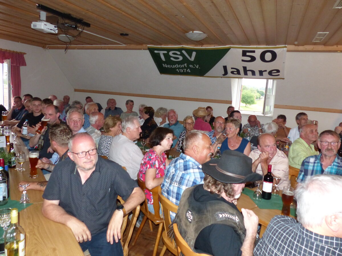 Brechend voll war das Sportheim anlässlich des Kommersabends des TSV. Vorsitzender Richard Zeiler und sein Stellvertreter Andreas Schärtl begrüßten die Gäste. „Alles, was uns Jungen vorgelebt wurde, führen wir fort“, so Richard Zeiler. „Solange es Mitglieder gibt, die sich aktiv einbringen, wird es einen TSV Neudorf geben“, fügte Zeiler hinzu. Viel hat sich in den 50 Jahren nicht geändert. Eines aber schon, die obligatorische eine Deutsche Mark für das Dress waschen, gibt es, nicht mehr.