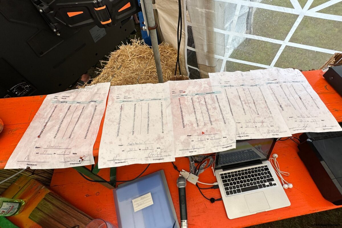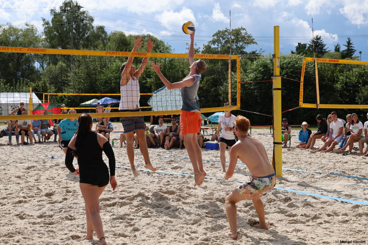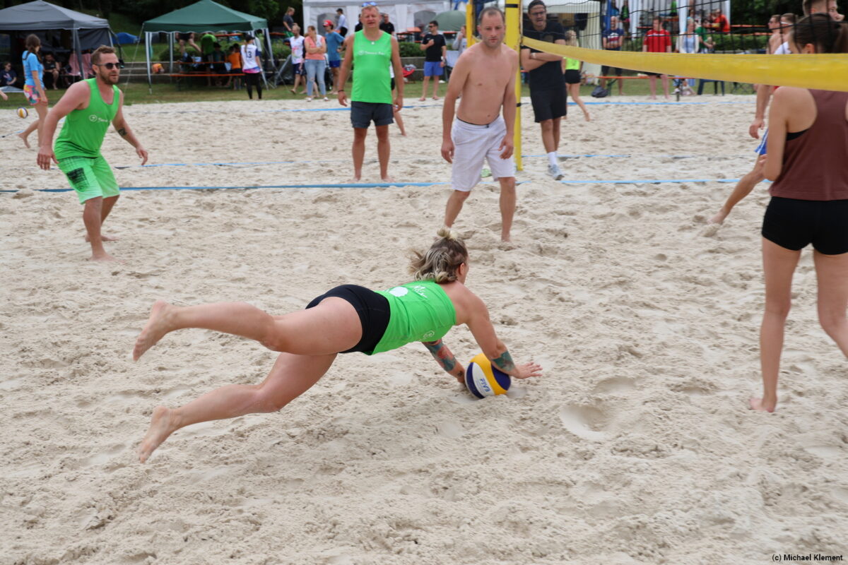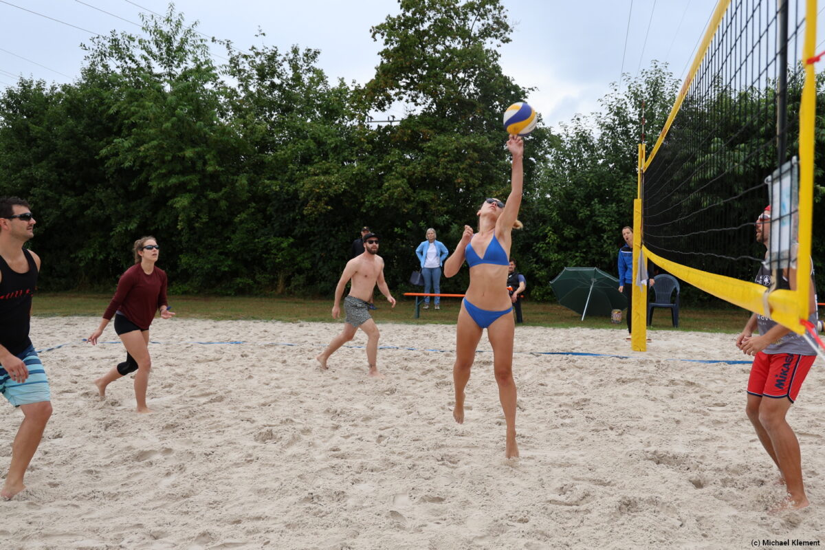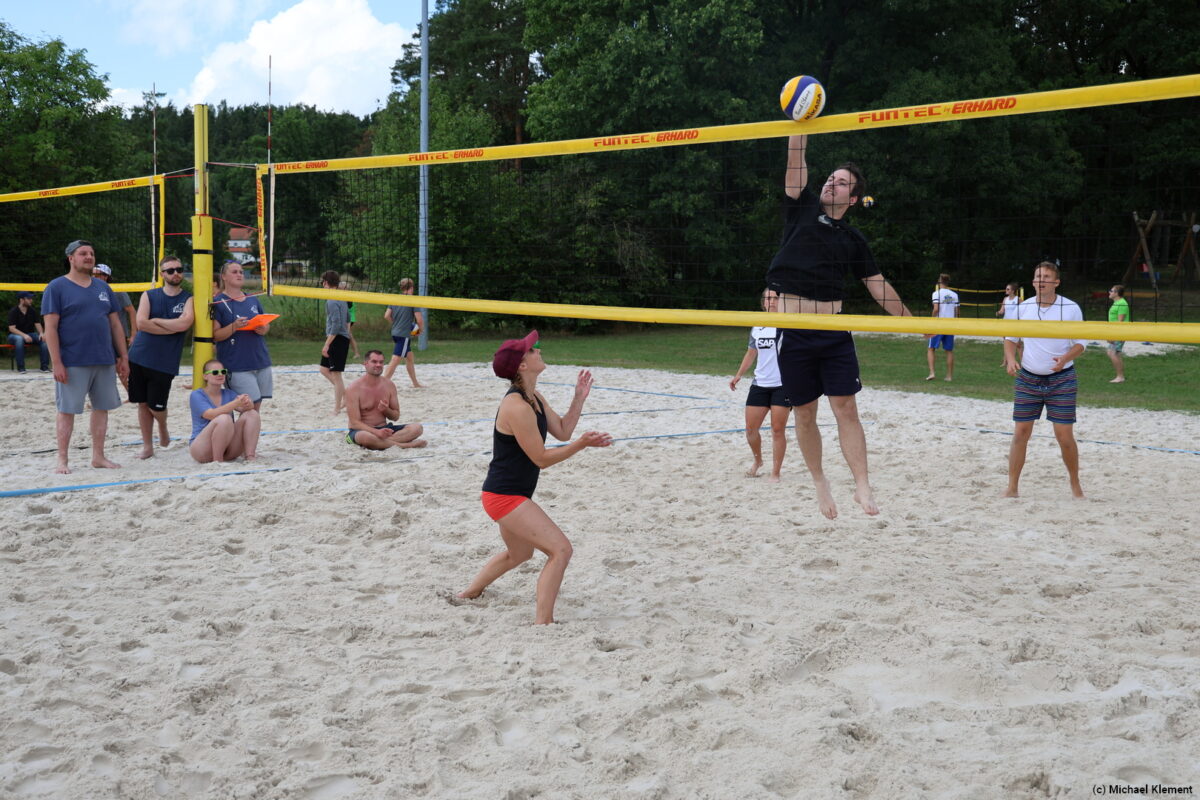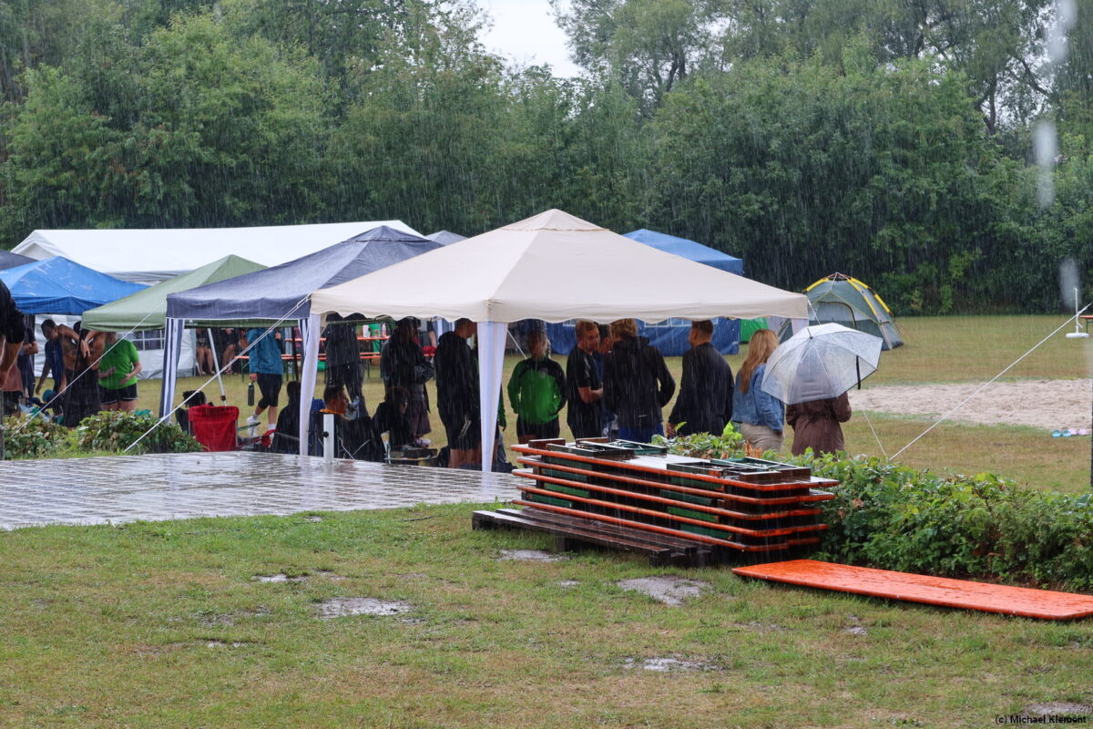 Pünktlich zum Start ging das erste kräftige Unwetter los – das machte den Ball schwer und gleichzeitig glitschig, den Sand klebrig und hart. Nicht jedes Team konnte mit der Situation angemessen umgehen und so gab es bereits die ersten Überraschungen. Eigentlich hätte das Team „Schlechtschmetterfront“ aus Grafenwöhr hier einen Vorteil haben können, am Ende reichte es aber nur für den 20. Platz im Fun-Cup.