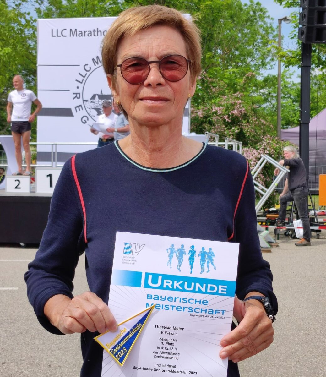 Marathon: Theresia Meier (TB Weiden) 04:12:28 Stunden (AK 60: 1. Platz; Frauen gesamt: 47. Platz) Theresia Meier verteidigte ihren Titel als Bayerische Senioren-Meisterin 2023. Daniel Michl (DJK Weiden), 02:57:43 (AK 35: 1. Platz; Männer gesamt: 12. Platz); Jürgen Steiner (DJK Weiden) 3:22:14 (AK 60: 3. Platz; Männer gesamt: 42. Platz).