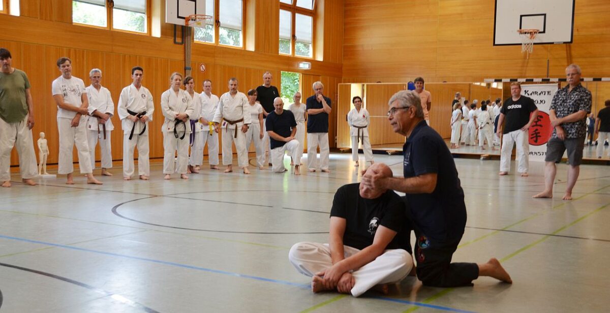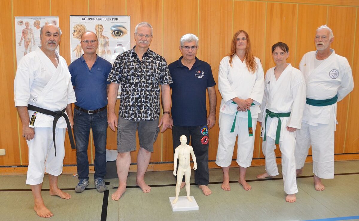 Die abschließende Trainingseinheit leitete der Arzt und Karateka Gerhard Kerscher (5. Dan Shotokahn, 4. Dan Kyusho Jitsu) aus Kümmersbruck mit dem Schwerpunkt Akkupunktur. Zusammen haben die beiden Referenten des Lehrgangs zuletzt auch ein Buch über Kuatsu und Akupressur in den Kampfkünsten verfasst.