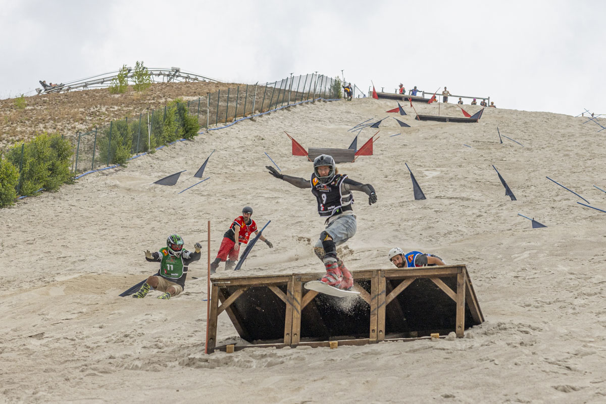 Hirschau. Der SandSpirit ist ein internationales Snowboard-Rennen auf Sand am Monte Kaolino in Hirschau. Die Fahrer haben sich in den Disziplinen Slalom sowie Cross gemessen und mussten beim Water-Slide ein Wasserloch bezwingen.