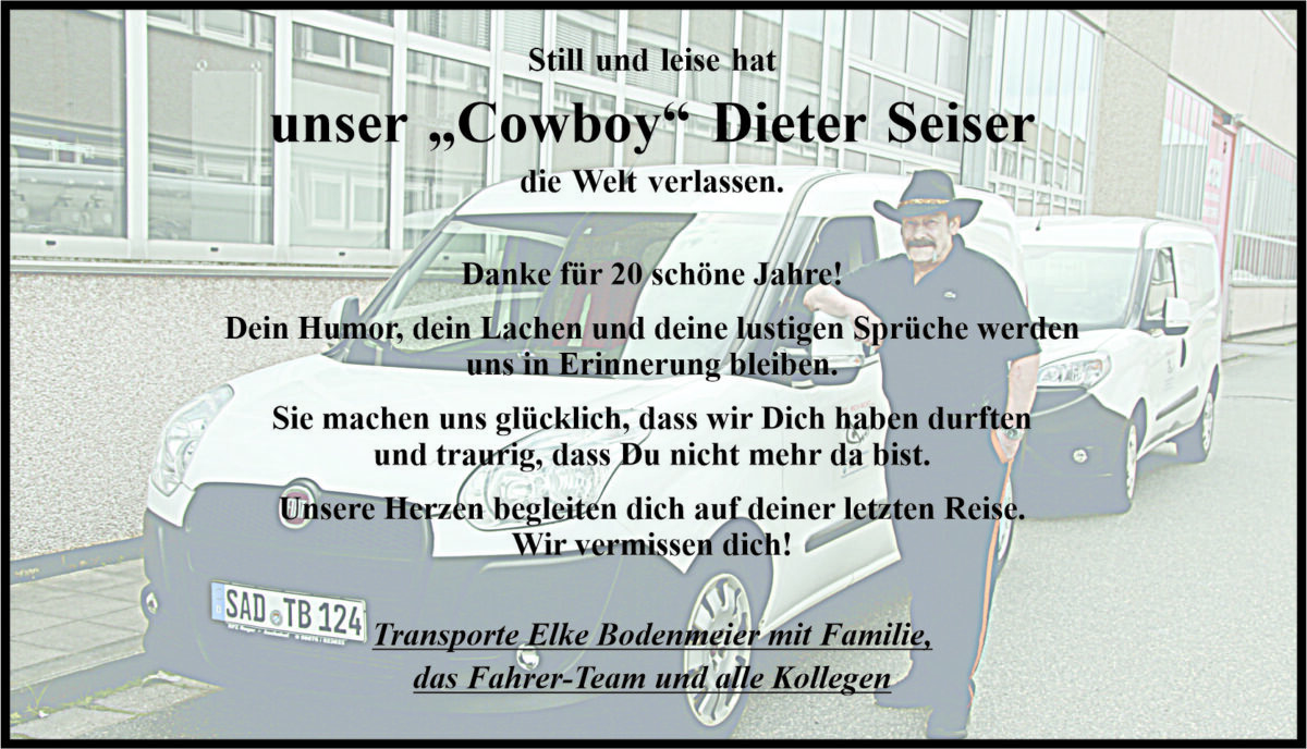 Danksagung Dieter Seiser, Latsch 08. August 2022, 06:00 Uhr Von: redaktion Danksagung Dieter Seiser, Latsch Stadtgebiete Weiden Weiden Stadt
