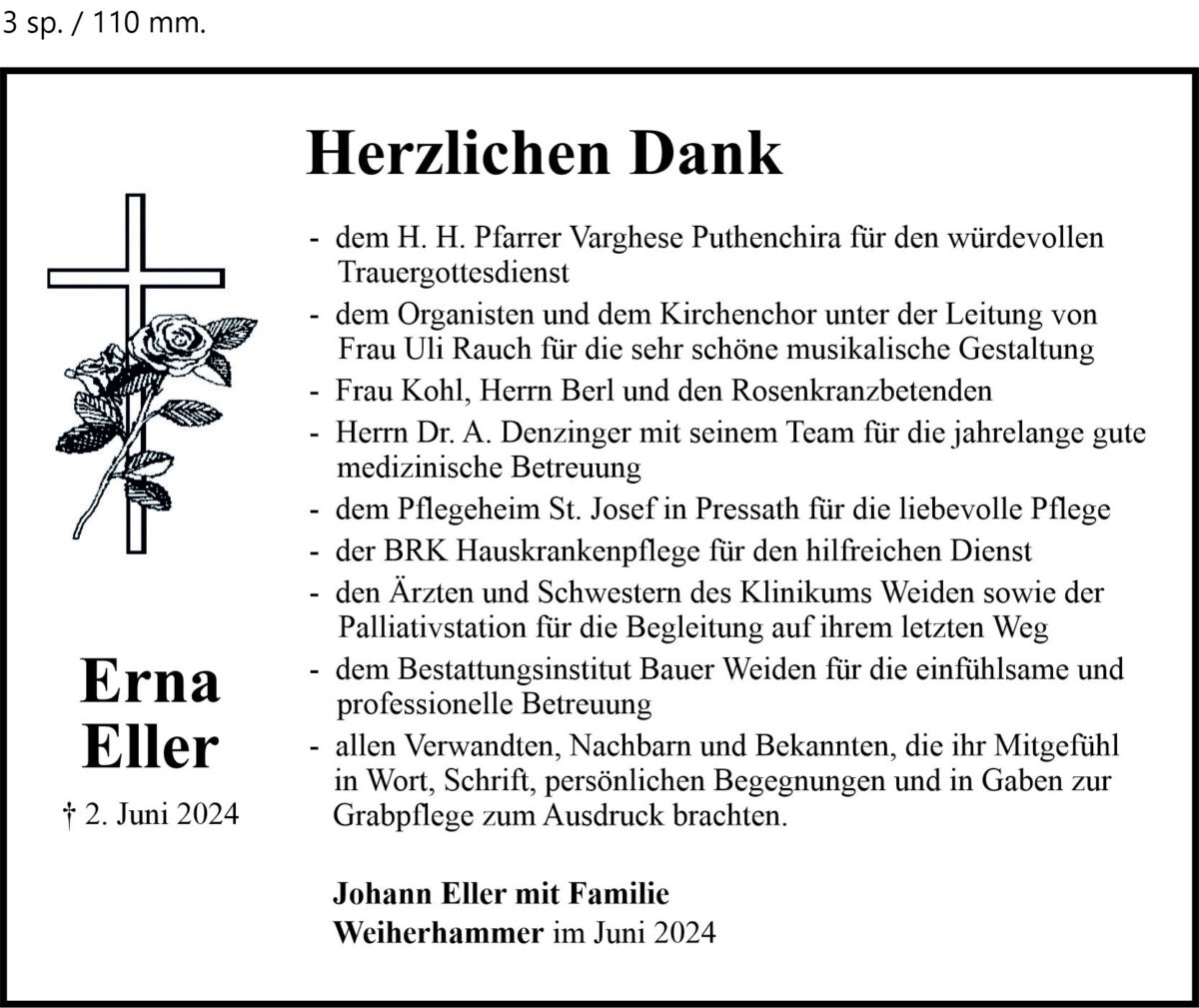 Danksagung Erna Eller, Weiherhammer 14. Juni 2024, 20:00 Uhr Von: redaktion Begleitet durch. Bestattung Bauer - Weiden Danksagung Erna Eller, Weiherhammer Landkreis Neustadt/WN Weiherhammer