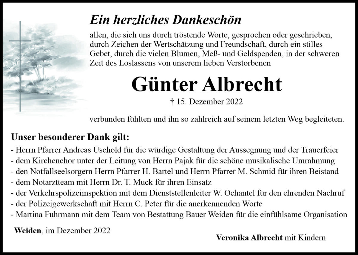 Danksagung Günter Albrecht, Weiden 31. Dezember 2022, 06:00 Uhr Von: redaktion Danksagung Günter Albrecht, Weiden Stadtgebiete Weiden Weiden Stadt