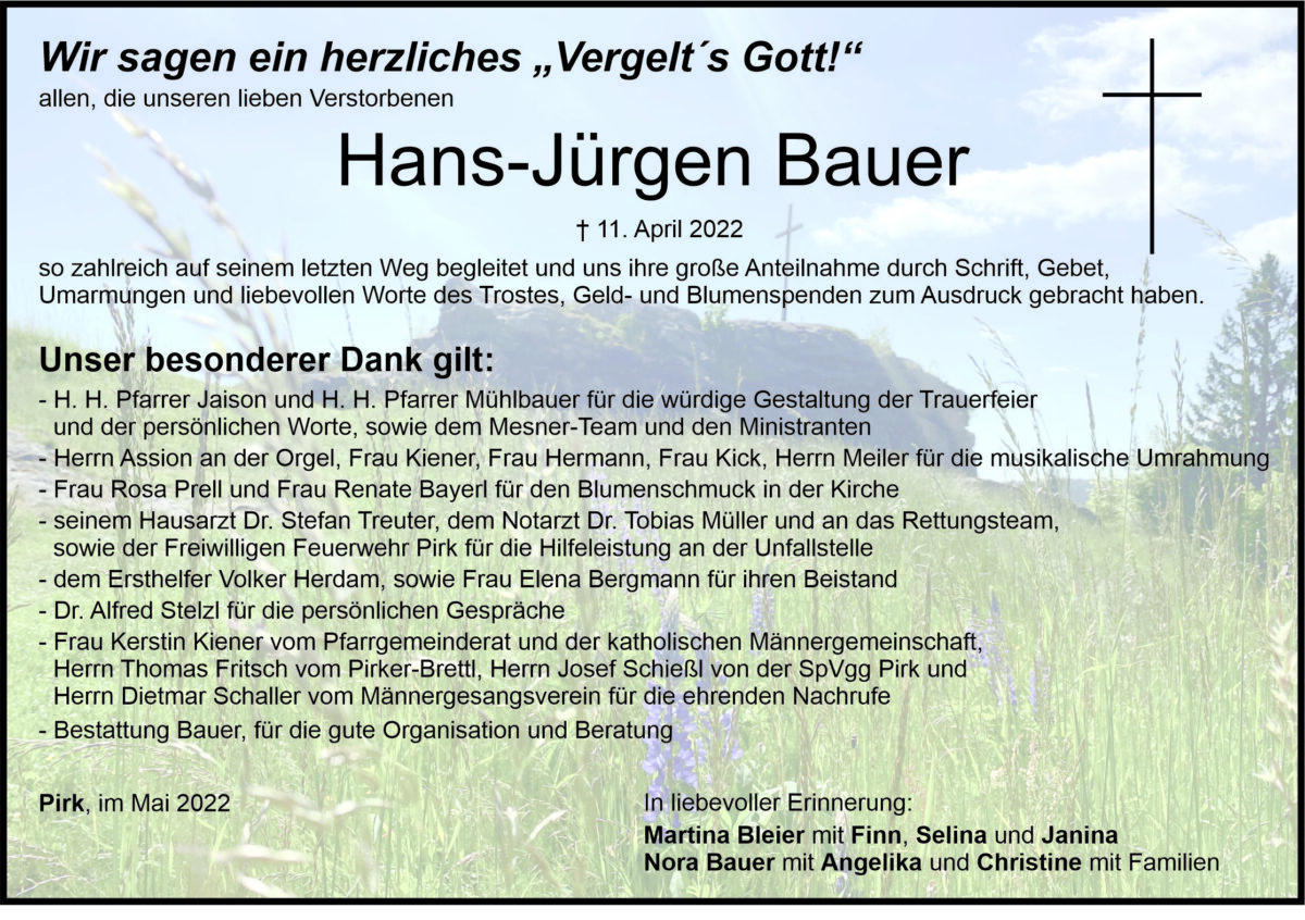 Danksagung Hans-Jürgen Bauer, Pirk 07. Mai 2022, 06:00 Uhr Von: redaktion Danksagung Hans-Jürgen Bauer, Pirk Landkreis Neustadt/WN Pirk