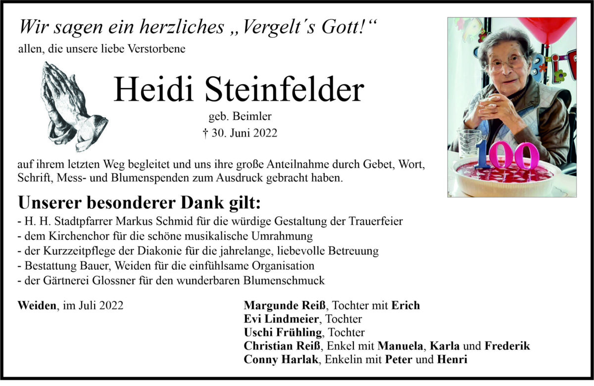Danksagung Heidi Steinfelder, Weiden 13. Juli 2022, 06:00 Uhr Von: redaktion Danksagung Heidi Steinfelder, Weiden Stadtgebiete Weiden Weiden Stadt