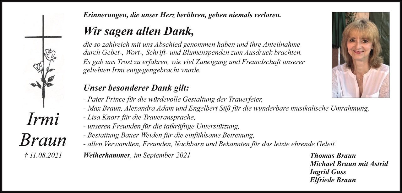 Danksagung Irmi Braun, Weiherhammer 04. September 2021, 04:00 Uhr Von: redaktion Danksagung Irmi Braun, Weiherhammer Landkreis Neustadt/WN Weiherhammer