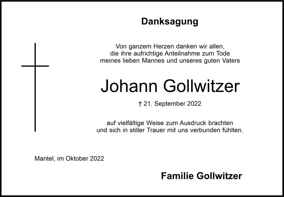 Danksagung Johann Gollwitzer, Mantel 15. Oktober 2022, 06:00 Uhr Von: redaktion Danksagung Johann Gollwitzer, Mantel Landkreis Neustadt/WN Mantel