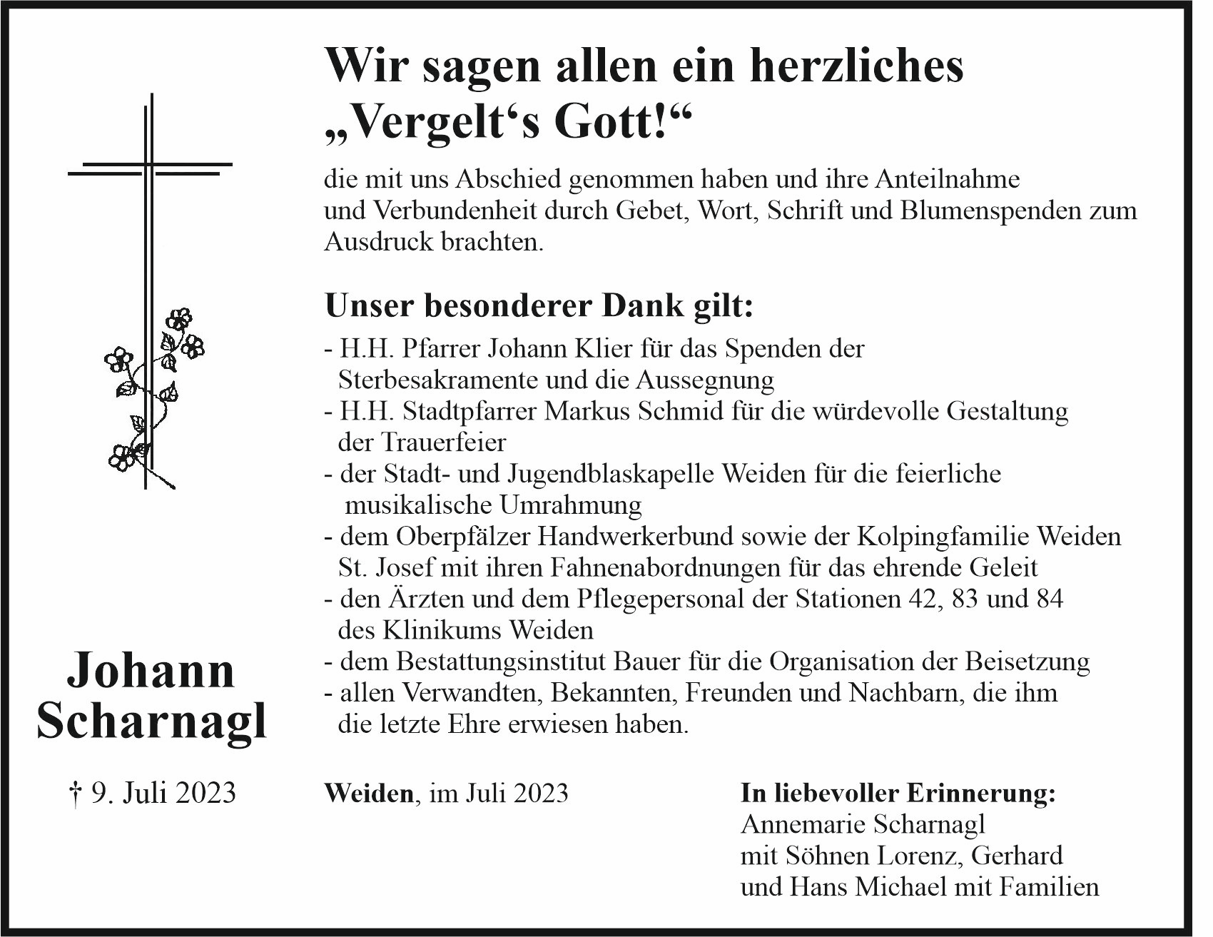 Danksagung Johann Scharnagl, Weiden 21. Juli 2023, 20:00 Uhr Von: redaktion Danksagung Johann Scharnagl, Weiden Stadtgebiete Weiden Weiden Stadt