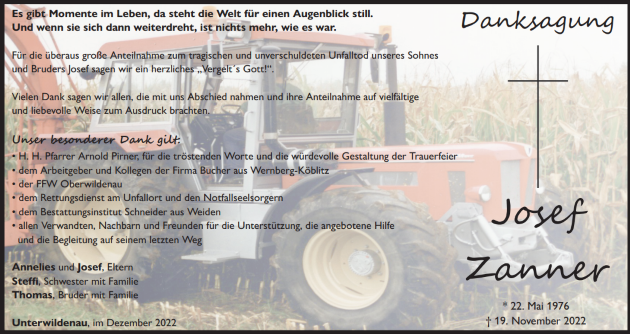 Danksagung Josef Zanner, Unterwildenau 10. Dezember 2022, 06:00 Uhr Von: redaktion Danksagung Josef Zanner, Unterwildenau Landkreis Neustadt/WN Luhe-Wildenau
