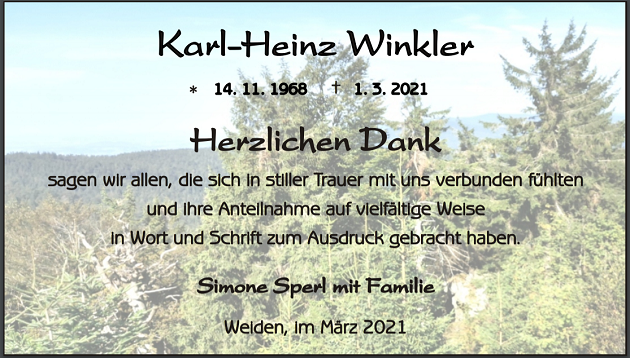Danksagung Karl-Heinz Winkler, Weiden 13. März 2021, 06:23 Uhr Von: redaktion Danksagung Karl-Heinz Winkler, Weiden Stadtgebiete Weiden Weiden Stadt