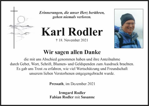 Danksagung Karl Rodler, Pressath 18. Dezember 2021, 05:00 Uhr Von: redaktion Danksagung Karl Rodler, Pressath Landkreis Neustadt/WN Pressath