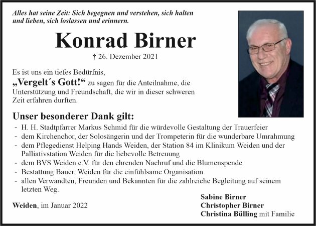 Danksagung Konrad Birner, Weiden 08. Januar 2022, 05:00 Uhr Von: redaktion Danksagung Konrad Birner, Weiden Stadtgebiete Weiden Weiden Stadt