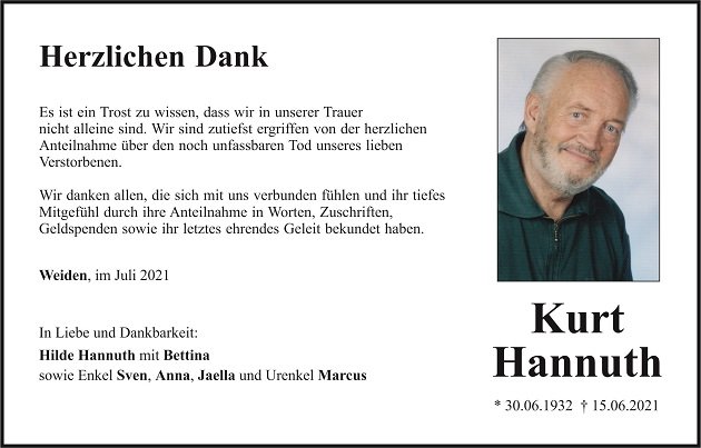 Danksagung Kurt Hannuth, Weiden 17. Juli 2021, 04:00 Uhr Von: redaktion Danksagung Kurt Hannuth, Weiden Stadtgebiete Weiden Weiden Stadt