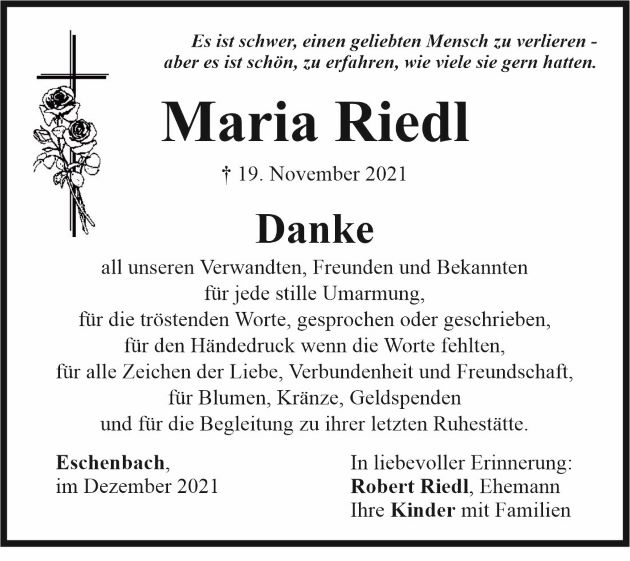 Danksagung Maria Riedl, Eschenbach 11. Dezember 2021, 05:00 Uhr Von: redaktion Danksagung Maria Riedl, Eschenbach Landkreis Neustadt/WN Eschenbach