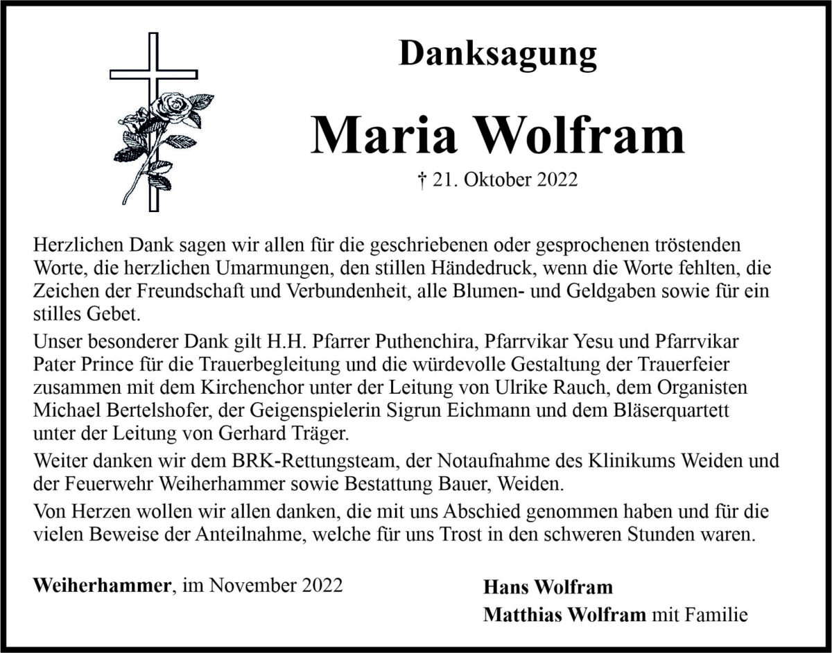 Danksagung Maria Wolfram, Weiherhammer 12. November 2022, 06:00 Uhr Von: redaktion Danksagung Maria Wolfram, Weiherhammer Landkreis Neustadt/WN Weiherhammer