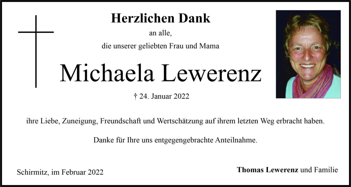 Danksagung Michaela Lewerenz, Schirmitz 12. Februar 2022, 06:00 Uhr Von: redaktion Danksagung Michaela Lewerenz, Schirmitz Landkreis Neustadt/WN Schirmitz