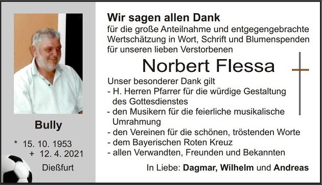 Danksagung Norbert Flessa, Dießfurt 01. Mai 2021, 04:00 Uhr Von: redaktion Danksagung Norbert Flessa, Dießfurt Landkreis Neustadt/WN Dießfurt