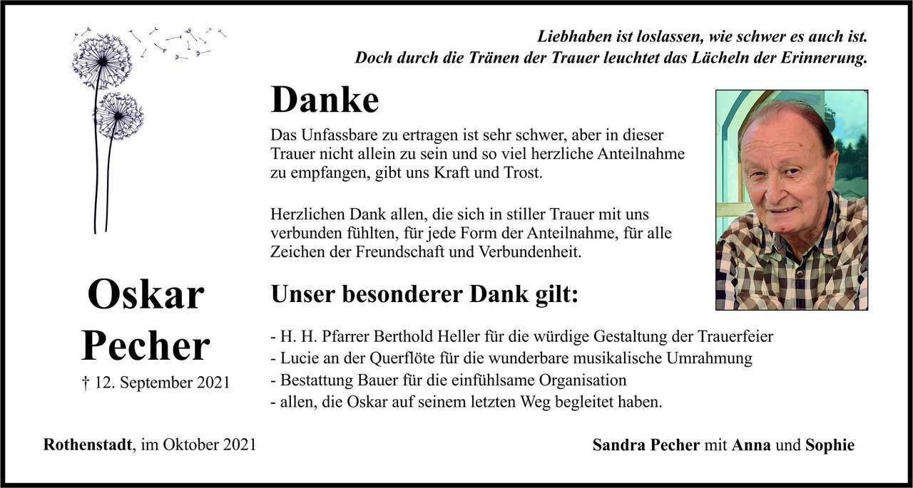 Danksagung Oskar Pecher, Weiden 02. Oktober 2021, 04:00 Uhr Von: redaktion Danksagung Oskar Pecher, Weiden Stadtgebiete Weiden Weiden Stadt