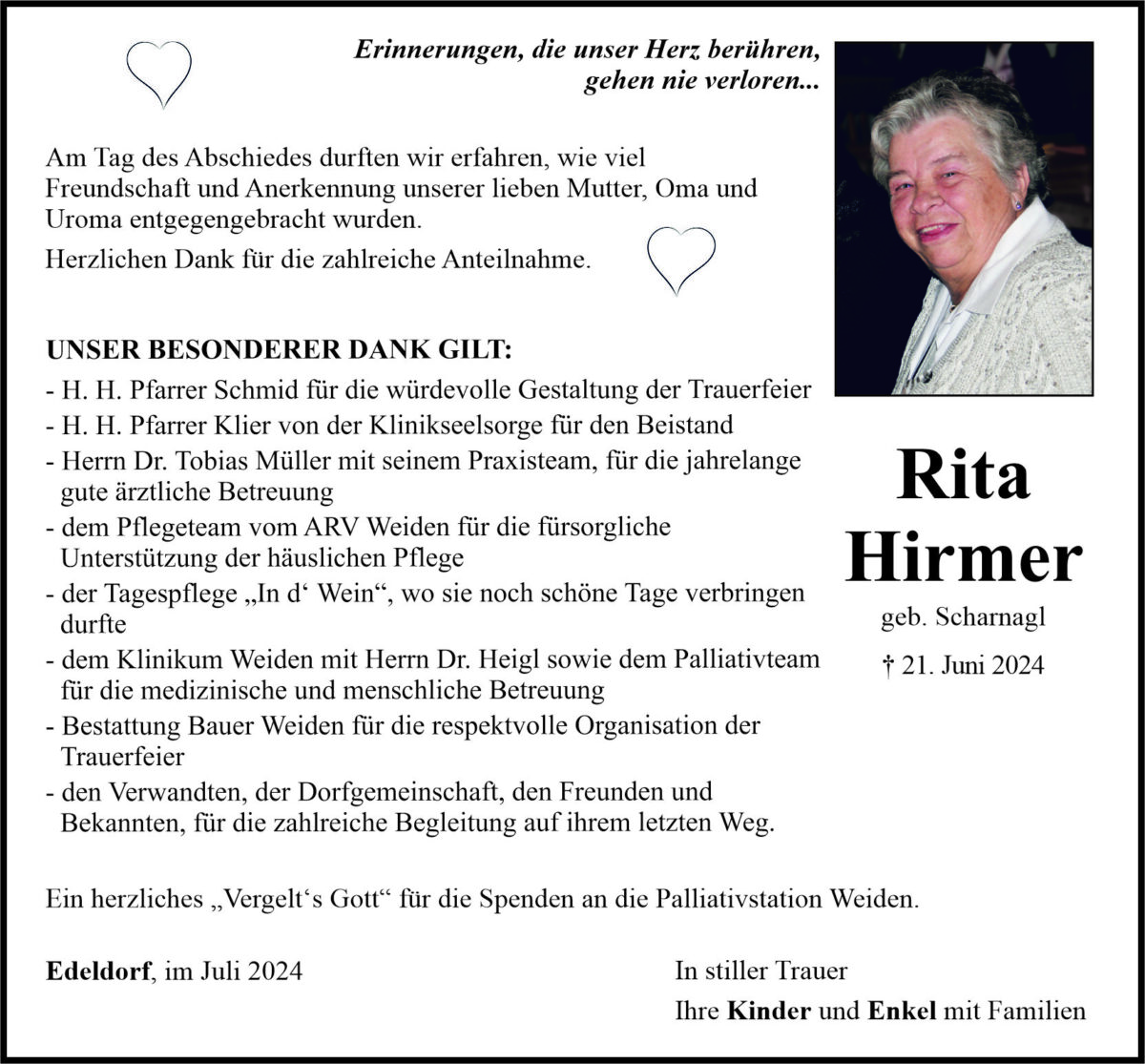 Danksagung Rita Hirmer, Edeldorf 12. Juli 2024, 20:00 Uhr Von: redaktion Begleitet durch: Bestattung Bauer - Weiden Danksagung Rita Hirmer, Edeldorf Stadtgebiete Weiden Theisseil