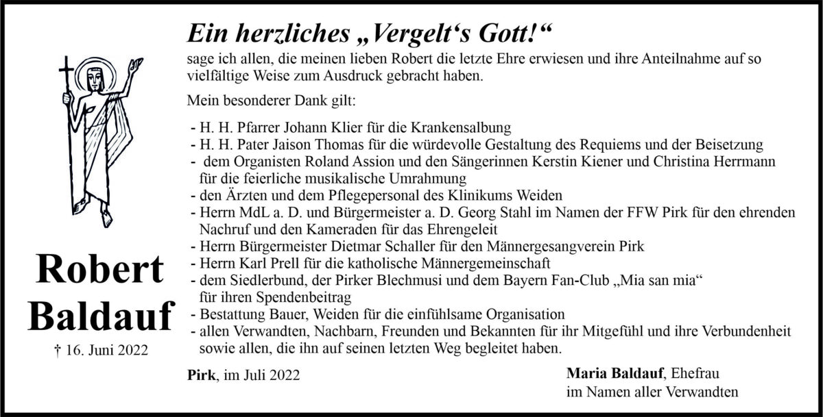 Danksagung Robert Ballauf, Pirk 16. Juli 2022, 06:00 Uhr Von: redaktion Danksagung Robert Ballauf, Pirk Landkreis Neustadt/WN Pirk
