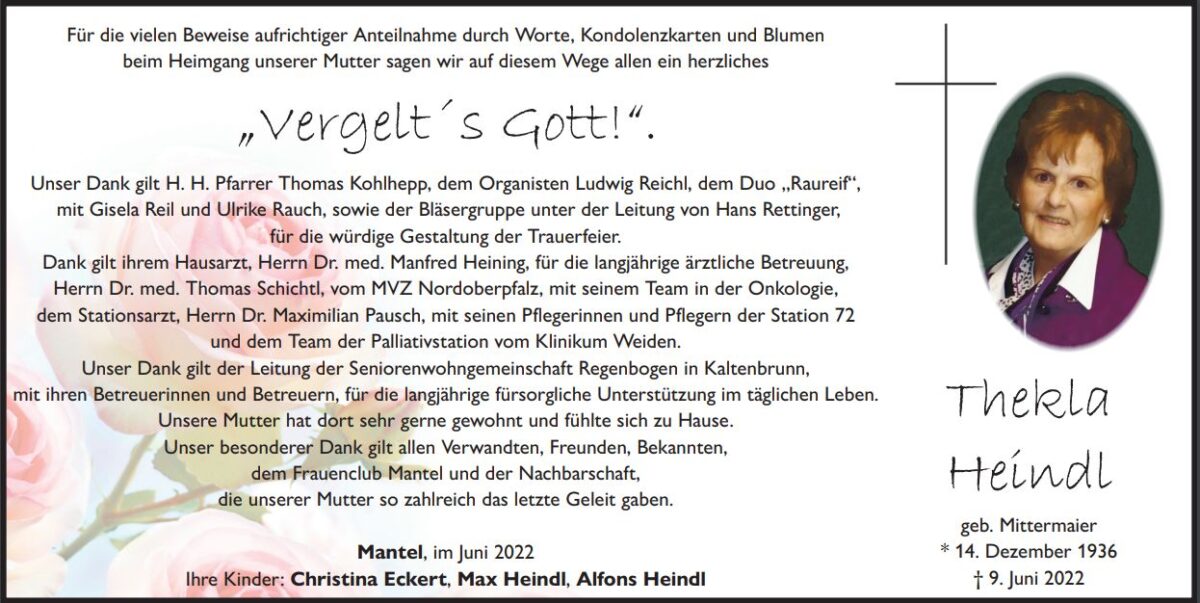 Danksagung Thekla Heindl, Mantel 18. Juni 2022, 06:00 Uhr Von: redaktion Danksagung Thekla Heindl, Mantel Landkreis Neustadt/WN Mantel