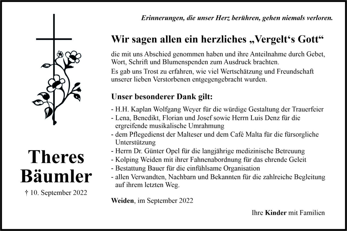 Danksagung Theres Bäumler, Weiden 24. September 2022, 06:00 Uhr Von: redaktion Danksagung Theres Bäumler, Weiden