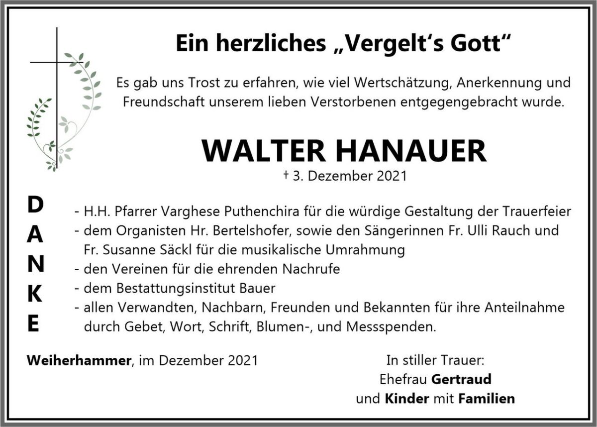 Danksagung Walter Hanauer, Weiherhammer 29. Dezember 2021, 05:00 Uhr Von: redaktion Danksagung Walter Hanauer, Weiherhammer Landkreis Neustadt/WN Weiherhammer