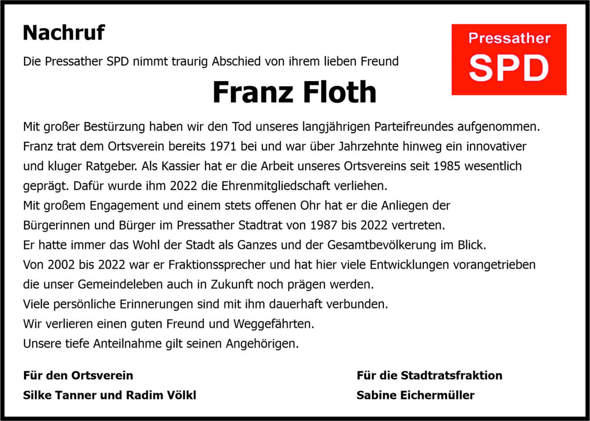 Nachruf Franz Floth, Pressath 17. Januar 2023, 17:00 Uhr Von: redaktion Nachruf Franz Floth, Pressath Landkreis Neustadt/WN Pressath