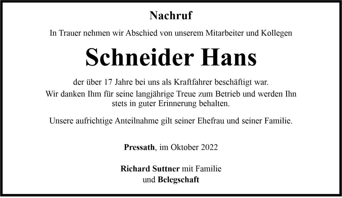 Nachruf Hans Schneider, Pressath 25. Oktober 2022, 06:00 Uhr Von: redaktion Nachruf Hans Schneider, Pressath Landkreis Neustadt/WN Pressath