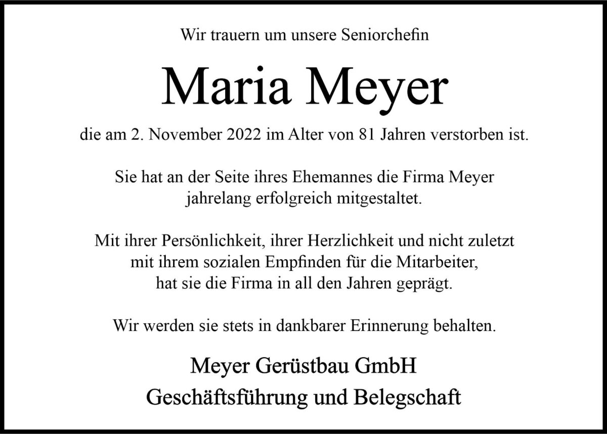 Nachruf Maria Meyer 07. November 2022, 06:00 Uhr Von: redaktion Nachruf Maria Meyer Stadtgebiete Weiden Weiden Stadt