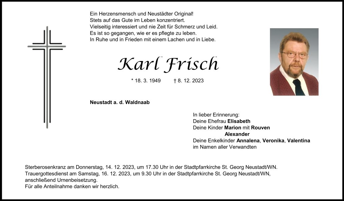 Todesanzeige Karl Frisch, Neustadt/WN 12. Dezember 2023, 20:00 Uhr Von: redaktion Todesanzeige Karl Frisch, Neustadt/WN Landkreis Neustadt/WN Neustadt/WN