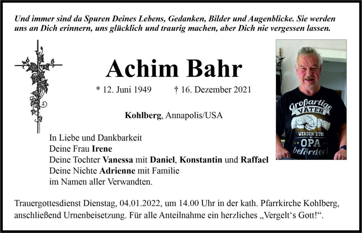 Traueranzeige Achim Bahr, Kohlberg 30. Dezember 2021, 05:00 Uhr Von: redaktion Traueranzeige Achim Bahr, Kohlberg Landkreis Neustadt/WN Kohlberg