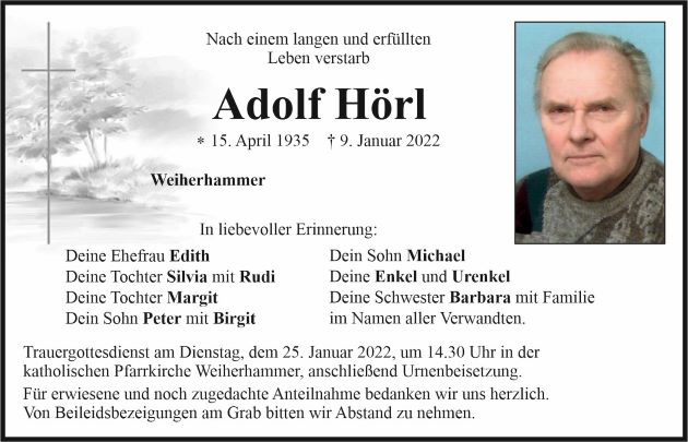 Traueranzeige Adolf Hörl, Weiherhammer 25. Januar 2022, 06:00 Uhr Von: redaktion Traueranzeige Adolf Hörl, Weiherhammer Landkreis Neustadt/WN Weiherhammer