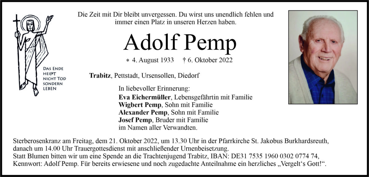Traueranzeige Adolf Pemp, Trabitz 18. Oktober 2022, 06:00 Uhr Von: redaktion Traueranzeige Adolf Pemp, Trabitz Landkreis Neustadt/WN Trabitz