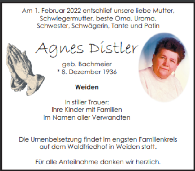 Traueranzeige Agnes Distler, Weiden 09. Februar 2022, 05:00 Uhr Von: redaktion Traueranzeige Agnes Distler, Weiden Stadtgebiete Weiden Weiden Stadt