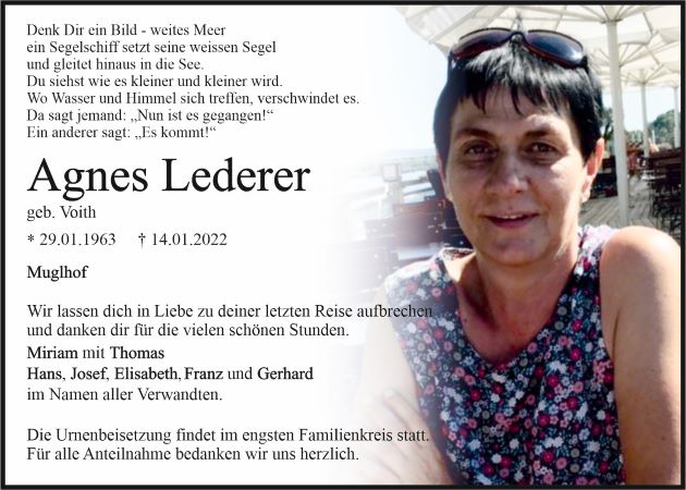 Traueranzeige Agnes Lederer, Muglhof 19. Januar 2022, 06:10 Uhr Von: redaktion Traueranzeige Agnes Lederer, Muglhof Stadtgebiete Weiden Weiden Stadt