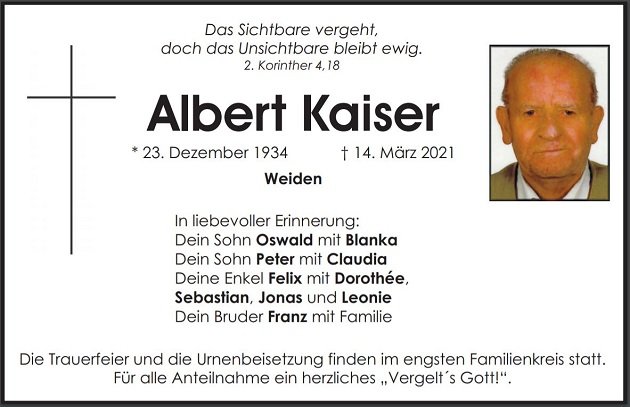Traueranzeige Albert Kaiser, Weiden 20. März 2021, 06:59 Uhr Von: redaktion Traueranzeige Albert Kaiser, Weiden Stadtgebiete Weiden Weiden Stadt