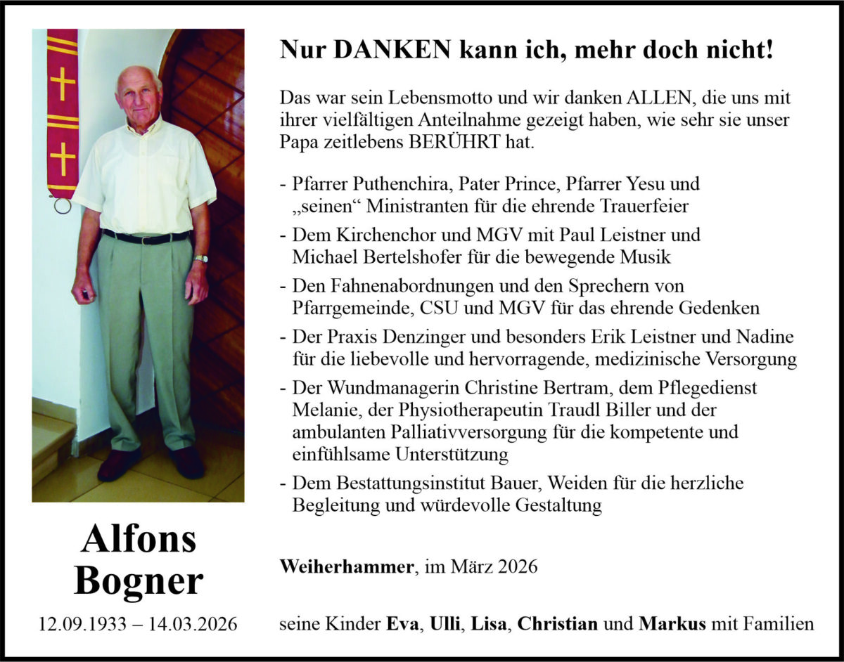 Danksagung Alfons Bogner, Weiherhammer 26. März 2026, 17:04 Uhr Von: redaktion Begleitet durch: Bestattung Bauer - Weiden Danksagung Alfons Bogner, Weiherhammer Landkreis Neustadt/WN Weiherhammer